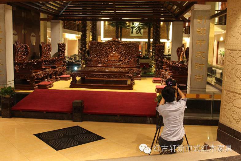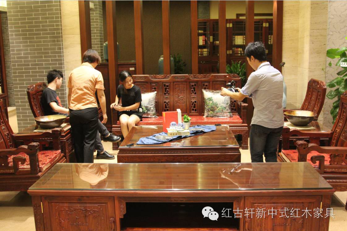 期間,攝影組分別在紅古軒紅木文化館、紅古軒“大涌鎮(zhèn)木材干燥”、紅古軒生產(chǎn)中心三地來回巡影。抵達(dá)之處,無不盛贊紅古軒品牌的規(guī)范化與精品化。其中,紅古軒的大紅酸枝、巴里黃檀、小葉紅檀喜氣十足的紅木家具,贏得了攝影師的高度盛贊,說,“90后小兩口太有眼光了!”